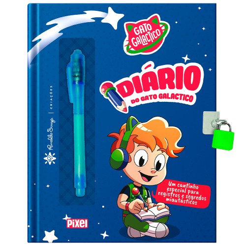 Um diário galáctico, uma caneta mágica e um espaço só seu no universo do Gato Galactico! Guarde memórias cósmicas, segredos estelares e ideias brilhantes em um lugar seguro e cheio de diversão. Com a caneta mágica, o que você escreve só aparece com a luz especial, perfeito para esconder mensagens secretas que só você pode revelar. Solte a imaginação, desenhe planetas incríveis, invente histórias espaciais, crie listas intergalácticas e preencha cada página com criatividade e carinho. Prepare-se para registrar momentos únicos e viver aventuras luminosas ao lado do Roni, do Astro, da Luna e de toda a turma.